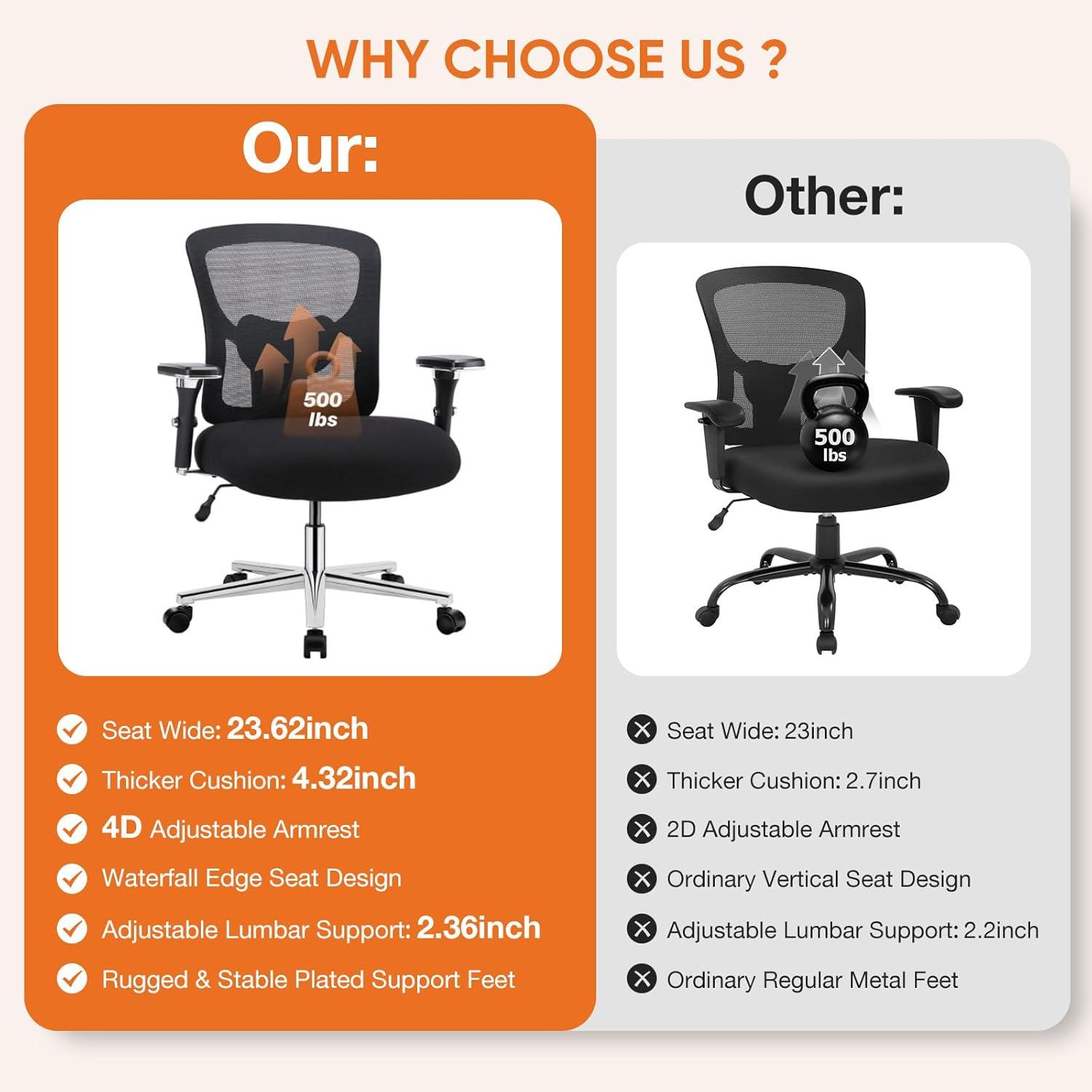 EXTRA LARGE AND COMFORTABLE HEAVYWEIGHT CHAIR – This home office chair has a wider and thicker seat cushion, better suited for taller people, and can hold up to 500 pounds. The extra large seat cushion (seat cushion size: 22D” X 26.77W”, 4.33″ thick) will bring you a more comfortable experience;
